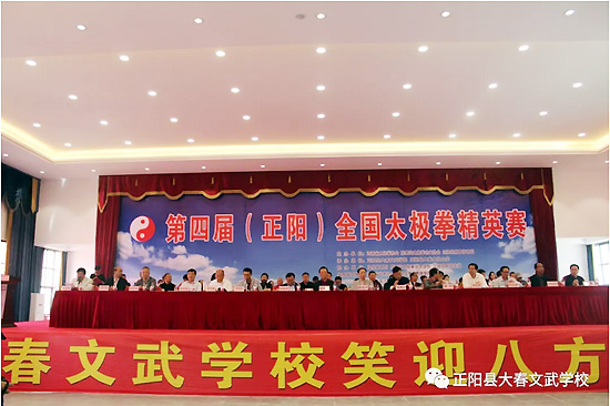 第四届(正阳)全国太极拳精英赛,由河南省太极拳协会、陈家沟太极拳功夫协会、正阳县教育体育局主办,正阳县大春文武学校正阳县大春太极山庄承办,中原资产中原股权有限公司 、温县体育局、陈家沟太极拳功夫学校、正阳花生国际城协办。